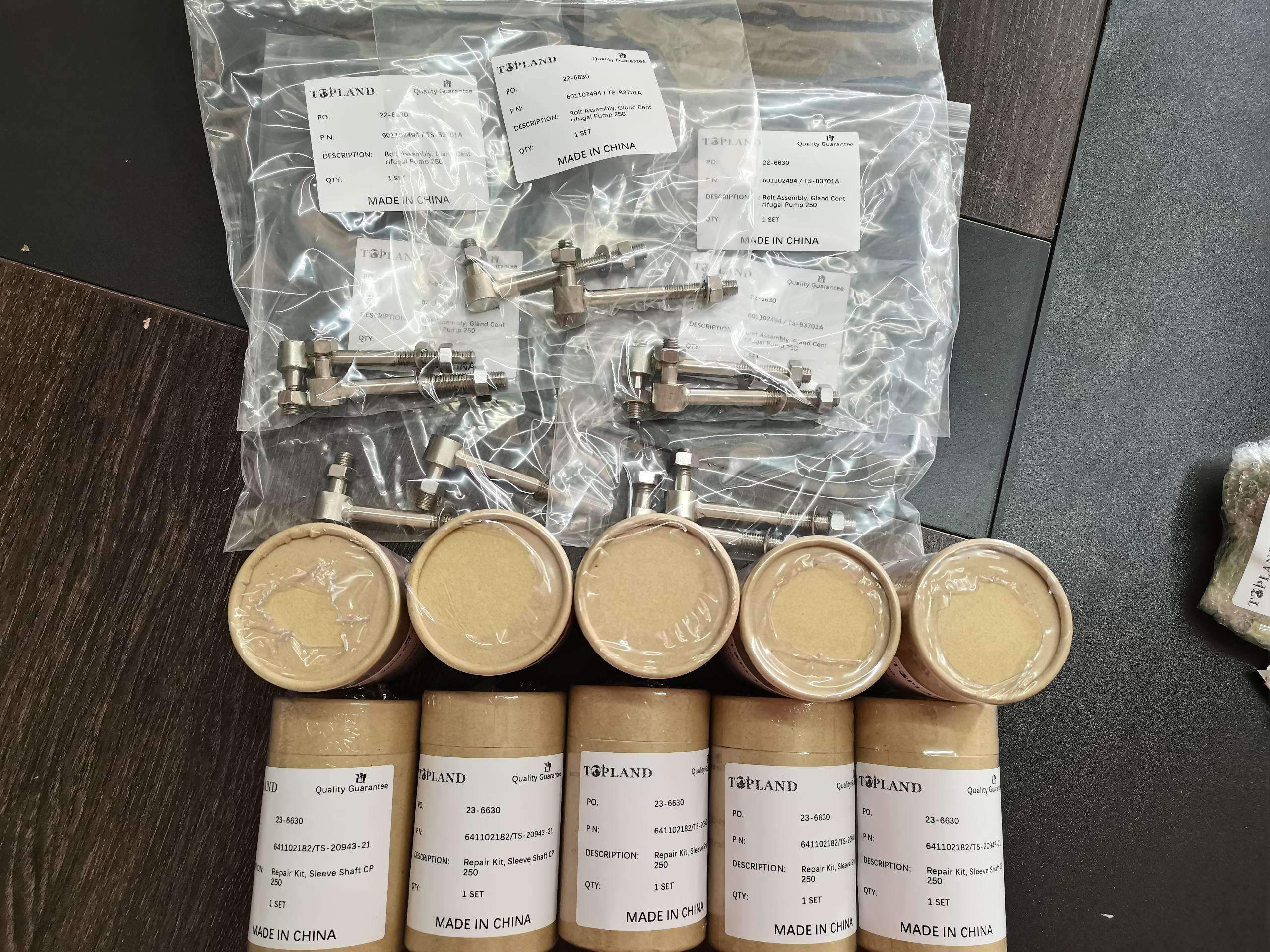 Topland finished the production of REPAIR KIT,SLEEVE SHAFT CP250 & BOLT ASSEMBLY, GLAND CENTRIFUGAL PUMP 250 recently and they have passed the strict quality inspection by our QC. Now they are ready for deliver to our overseas client.